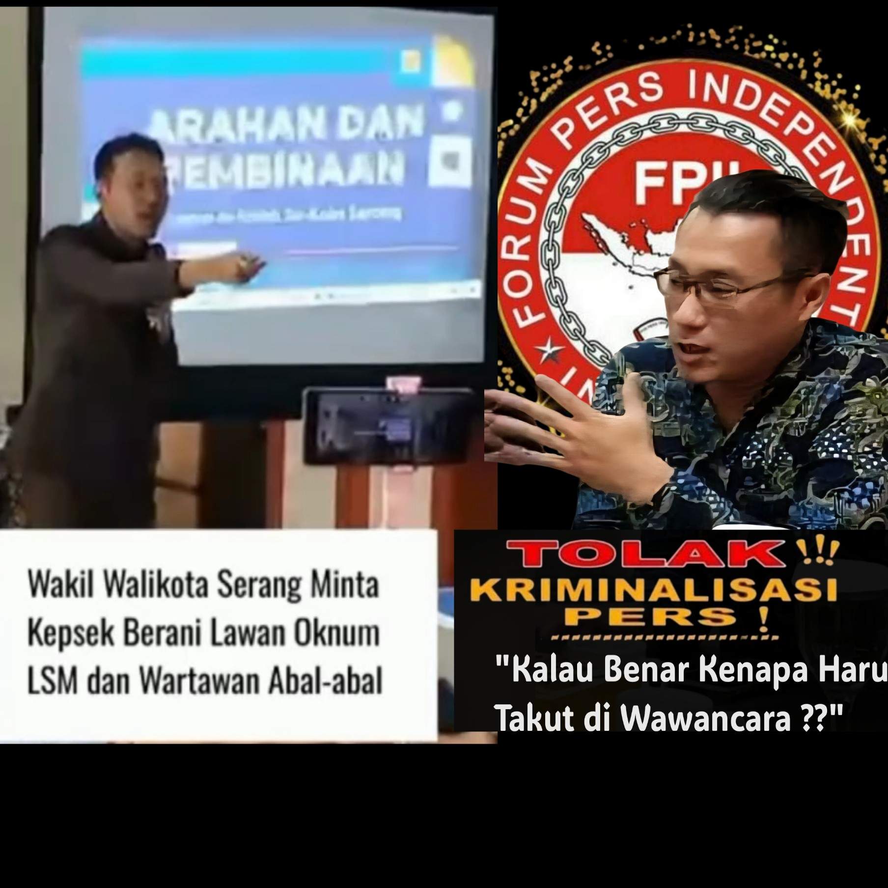 Kami Organisasi Pers Forum Pers Independent Indonesia kecam keras dan ingatkan Wakil Walikota Serang jangan membuat pernyataan yang tidak etis dan menyebarkan kebencian terhadap insan pers , karena pernyataan ini memperkuat pentingnya ruang demokrasi dan kebebasan pers sebagai pilar dalam sistem pemerintahan yang transparan dan akuntabel.