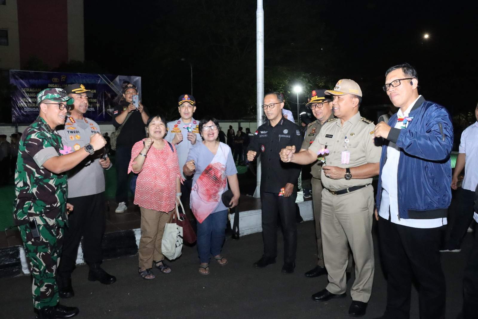 Dua ibu-ibu, Ibu Yani dan Ibu Rita, dari komunitas peduli bangsa asal Kwitang, datang khusus untuk memberikan dukungan kepada para petugas yang tengah berjaga memastikan keamanan wilayah. Kehadiran mereka menjadi warna tersendiri di tengah suasana apel malam hari.
