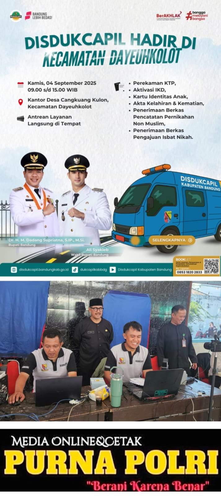 Kab. Bandung, MP-POLRI – Pemerintah Kabupaten Bandung melalui Dinas Kependudukan dan Catatan Sipil (Disdukcapil) kembali hadir di tengah-tengah masyarakat Kecamatan Dayeuhkolot, Kamis (4/9/2025) untuk memberikan antrean layanan langsung di tempat.