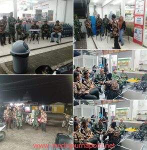 Bati Tuud Koramil 07/AKB Pelda. BJ. Pulungan beserta 4 orang anggota melaksanakan kegiatan Patroli Gabungan bersama Siskamling (Jaga Ronda malam) pada lokasi rawan gangguan Kamtibmas di wilayah Kec Na IX-X Kabupaten Labuhan Batu Utara bersama dengan FKPPI 07/AKB, diawali dengan apel dan pengecekan Personil dihalaman Koramil 07/ AKB.