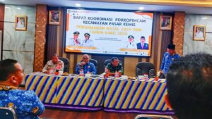 Rapat koordinasi tersebut dipimpin langsung oleh Camat Pasar Kemis H. Nurhanudin, S.IP., M.Si., dan dihadiri unsur Forkopimcam, antara lain perwakilan Polsek Pasar Kemis, Koramil, Satpol PP, serta unsur perangkat kecamatan dan instansi terkait lainnya.