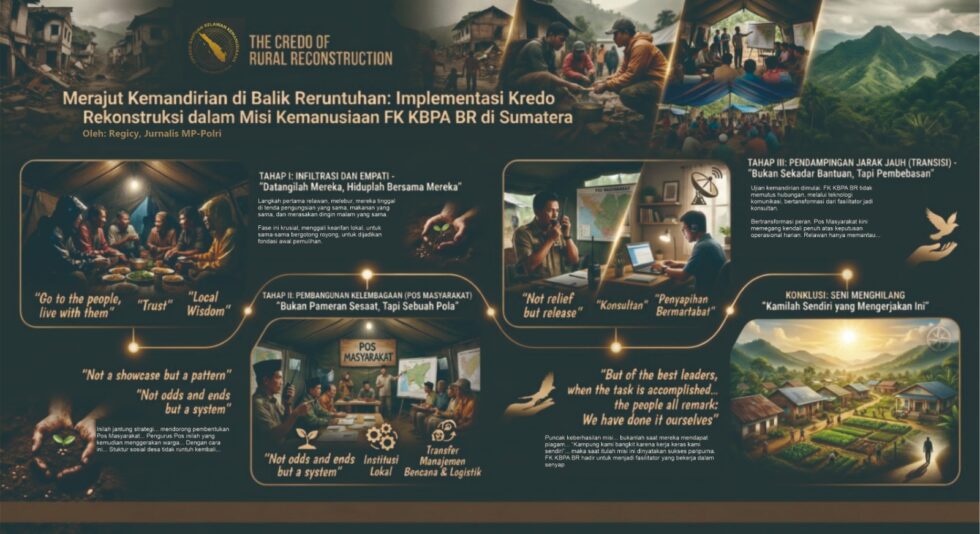 BANDUNG, MP-POLRI – Bencana alam—baik yang melanda Aceh, Sumatera Utara, maupun Sumatera Barat—selalu menyisakan dua jenis reruntuhan: reruntuhan fisik bangunan dan reruntuhan keberdayaan manusia. Sementara banyak pihak berfokus membereskan puing fisik, Forum Komunikasi Keluarga Besar Pencinta Alam Bandung Raya (FK KBPA BR) hadir dengan misi berbeda: membangun kembali manusia dan sistem sosialnya.