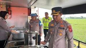Kapolres Karawang AKBP Fiki Novian Ardiansyah menyampaikan bahwa dapur lapangan tersebut mampu memproduksi ratusan porsi makanan setiap harinya untuk membantu kebutuhan warga terdampak banjir.