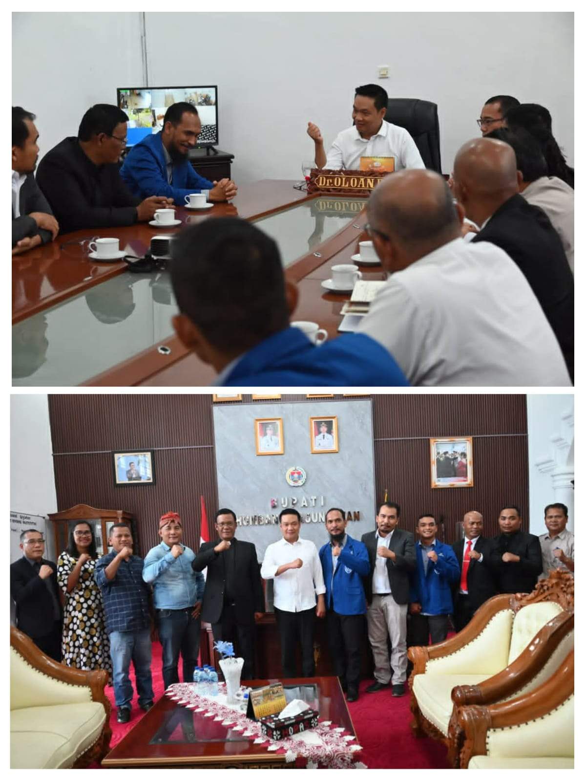 Doloksanggul, MP-POLRI – Bupati Humbahas Dr. Oloan Paniaran Nababan, S.H., M.H., didampingi Sekda Chiristison Rudianto Marbun, Kadis Pariwisata Pemuda dan Olahraga Dina Simamora, serta perangkat daerah, sambut kunjungan organisasi DPC GAMKI (Gerakan Angkatan Muda Kristen Indonesia) Kabupaten Humbahas, di ruang kerja Bupati, Rabu (15/04/2026).