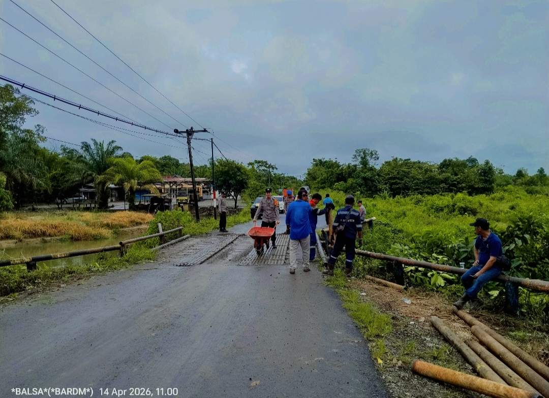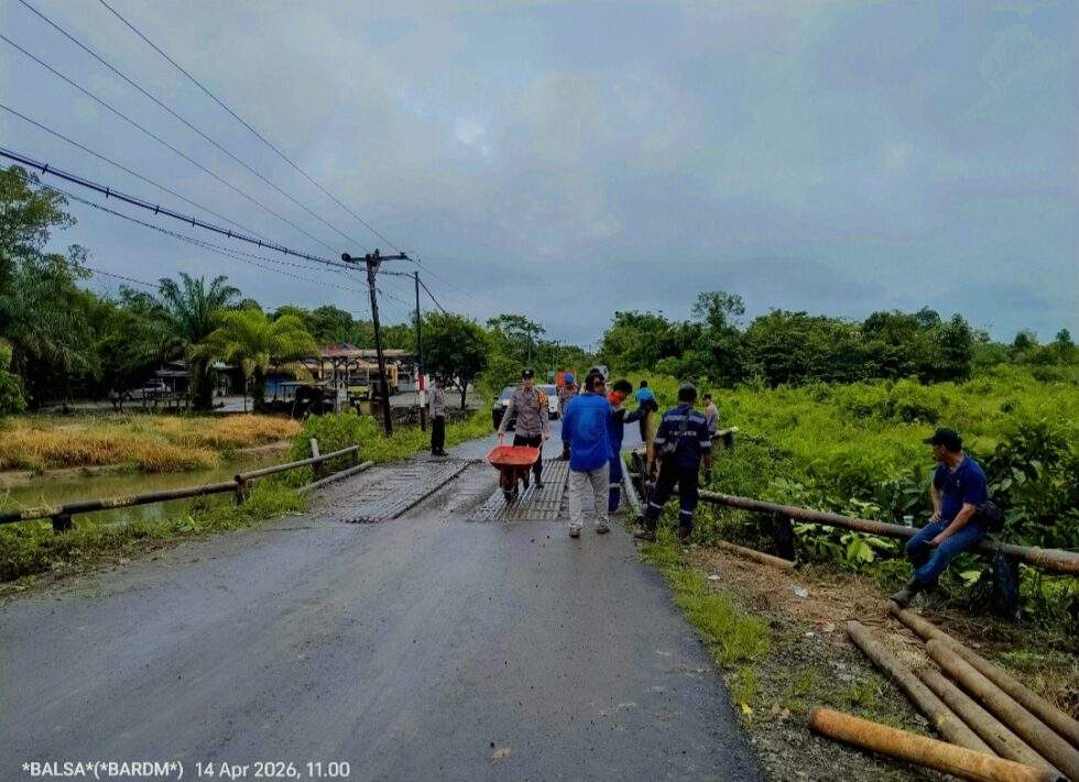 Musi rawas, MP-POLRI – Kecamatan Bts Ulu.  Kepedulian terhadap keselamatan pengguna jalan ditunjukkan oleh jajaran Polsek Kecamatan. Bts Ulu bersama ketua LPLH DPC, Kecamatan. Bts Ulu dan Ketua LSM Kelurahan Bangun Jaya bersama tokoh masyarakat dan warga setempat, mereka bergotong royong memperbaiki jalan yang belubang dan minim nya penerangan, dan memperbaiki pagar pembatas jembatan sungai jerni yg bertempat di kelurahan. Bangun Jaya, Kecamatan. Bts Ulu, Lintas Musi Rawas-Pali. pada hari Selasa (14/04/2026).