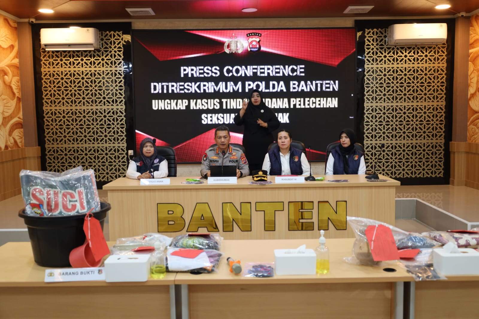 Dalam Press Conference yang di gelar Ruang Ditreskrimum Polda Banten pada Senin (20/04). Kegiatan dipimipin oleh Kabid Humas Polda Banten Kombes Pol Maruli Ahiles Hutapea didampingi Kasubdit IV Renakta Ditreskrimum Polda Banten AKBP Irene Missy dan dihadiri oleh perwakilan Komnas Perlindungan Anak Kabupaten Serang.