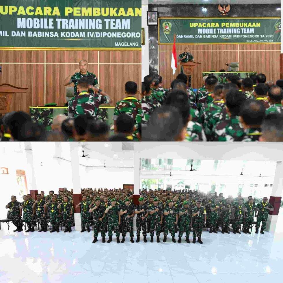 – Pusat Teritorial Angkatan Darat (Pusterad) menggelar kegiatan Mobile Training Team (MTT) Tahun Anggaran 2026 yang di ikuti oleh 200 peserta, terdiri dari 50 Komandan Koramil (Danramil) dan 150 Bintara Pembina Desa (Babinsa) jajaran Kodam IV/ Diponegoro. Kegiatan ini berlangsung di Aula A. Yani Rindam IV/Diponegoro, Magelang, Jawa Tengah, Senin (20/4/2026).